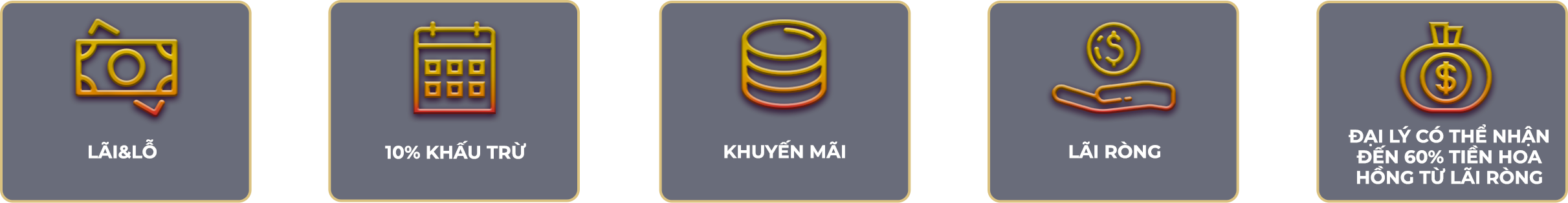 2.1. Hoa hồng đại lý lên đến 60% tùy thuộc vào người chơi đạt chuẩn hàng tháng của bạn, đại lý phải có ít nhất 5 người chơi đạt chuẩn hàng tháng thì mới đủ điều kiện được hưởng hoa hồng